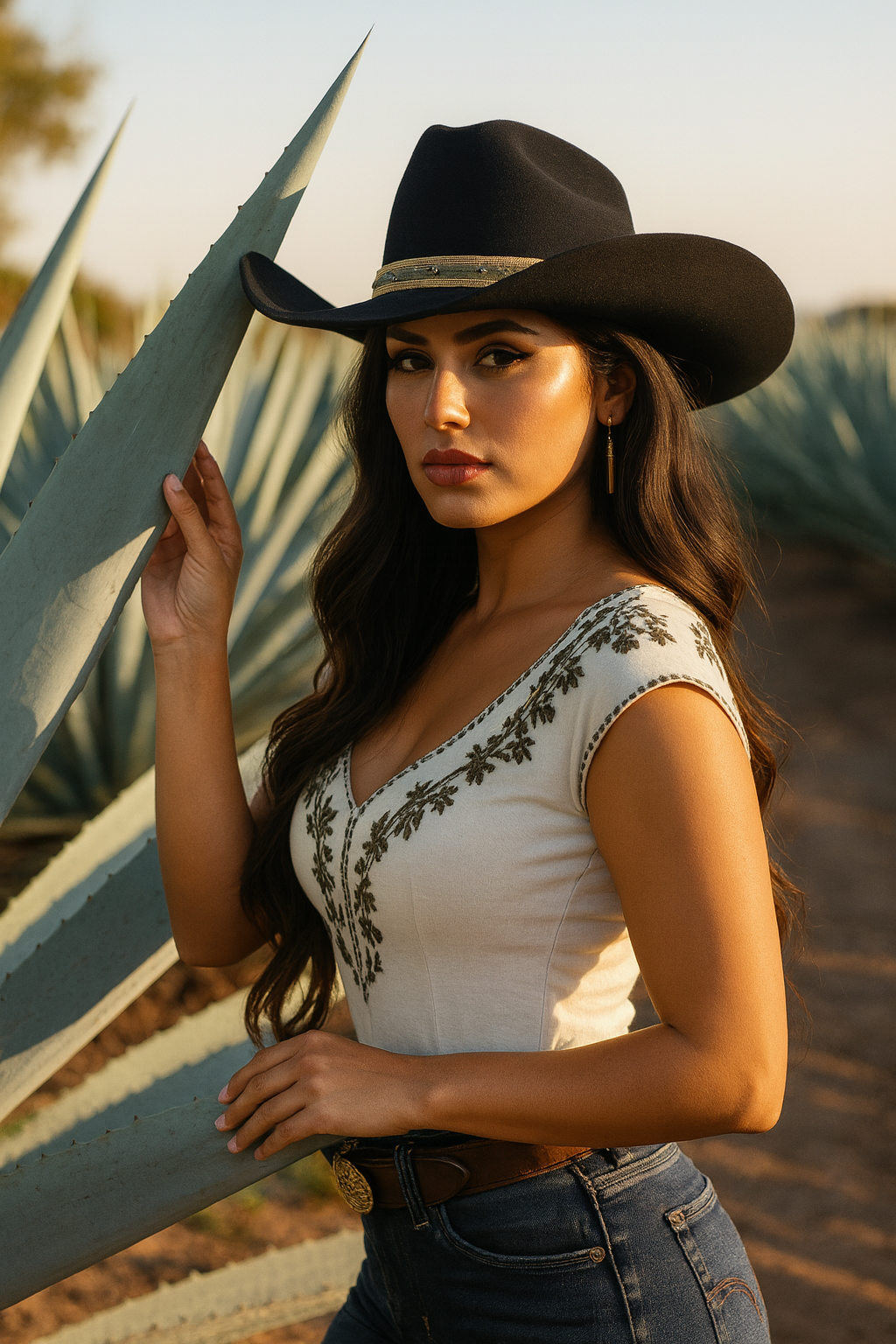 El modelo GILDA es la definición perfecta de sofisticación vaquera. Este sombrero de gamuza negra con horma texana Chihuahua no solo eleva cualquier Outfit, lo transforma por completo. Su toquilla personalizada dorada con remaches metálicos una declaración ideal para quienes no temen destacar y marcar estilo.